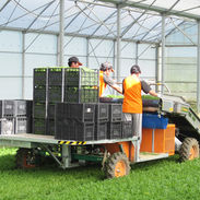 Cuenta con una plataforma central destinada a los operarios o a la instalación de accesorios, así como una plataforma posterior plegable para la gestión de cajas vacías y llenas. El control automático de la altura de corte se realiza mediante sensores electrónicos con patines que se deslizan entre las plantas, evitando dañar la raíz y permitiendo el rebrote para cosechas posteriores.